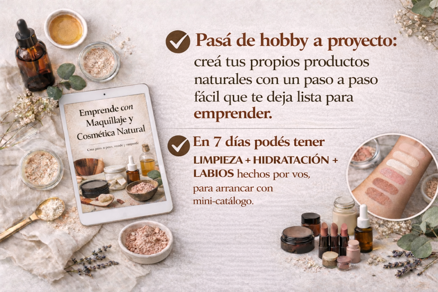 Vas a aprender a realizar distintas recetas de maquillaje y cosmética natural, para uso personal o para dar tus primeros pasos emprendiendo.